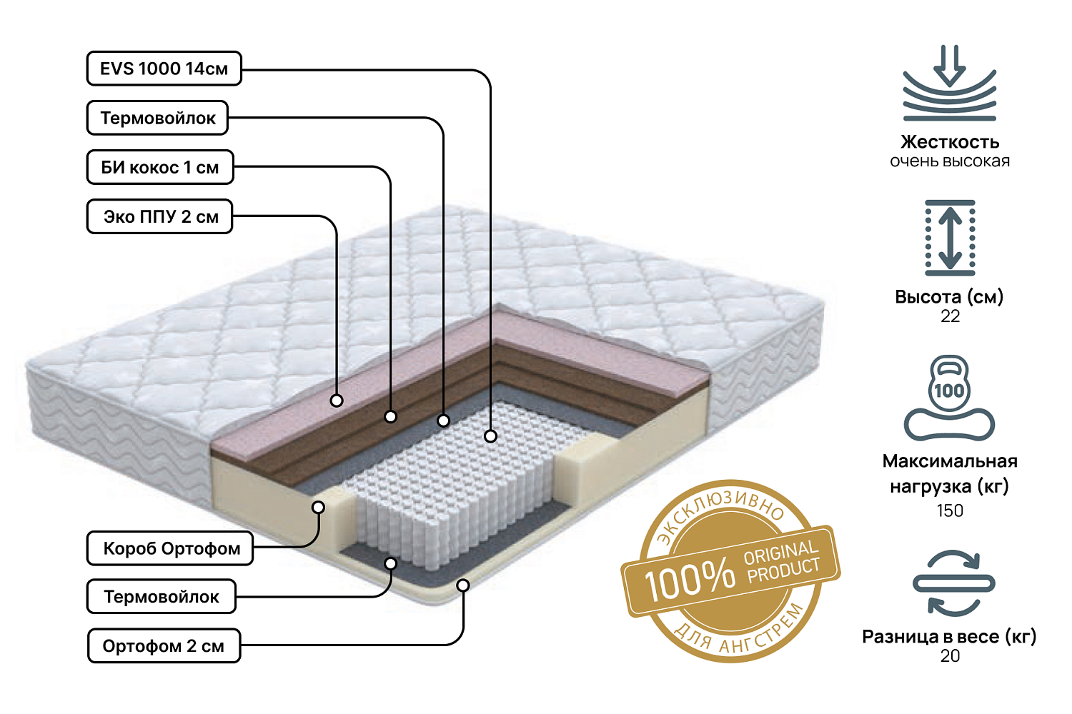 Односторонний матрас очень высокой жесткости. В основе матраса - интеллектуальный блок независимых пружин 1000 пружин на спальное место. В сочетании с двойным слоем Би кокоса и слоем Эко ППУ обеспечат надежную поддержку вашего позвоночника. В основе матраса опорный слой Ортофом, позволяющий равномерно распределить нагрузку. Чехол матраса выполнен из трикотажной ткани, простеганный на дополнительном слое Ортофом.